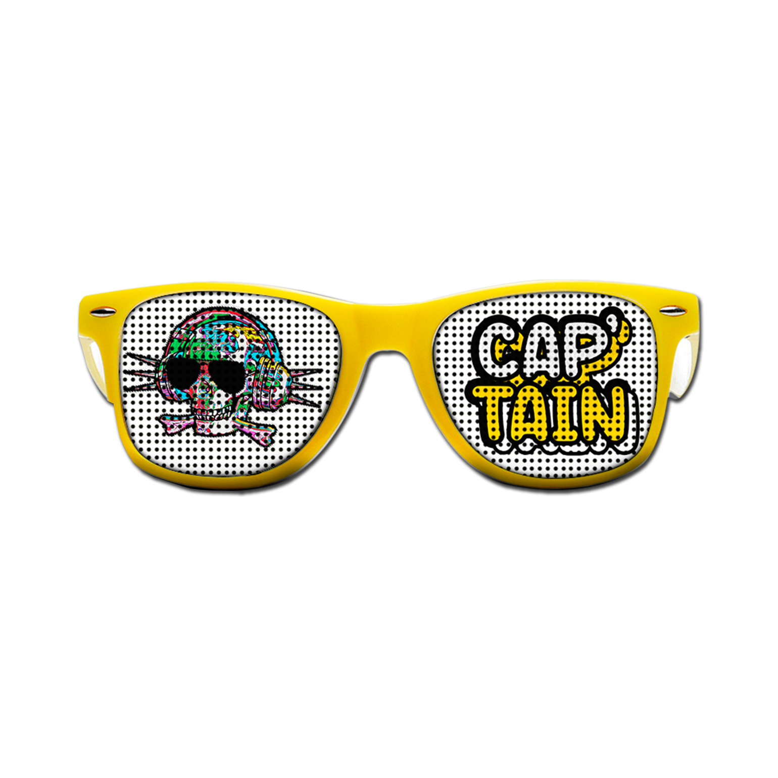 Monture jaune, verres blancs et inscriptions CAP'TAIN multicolores