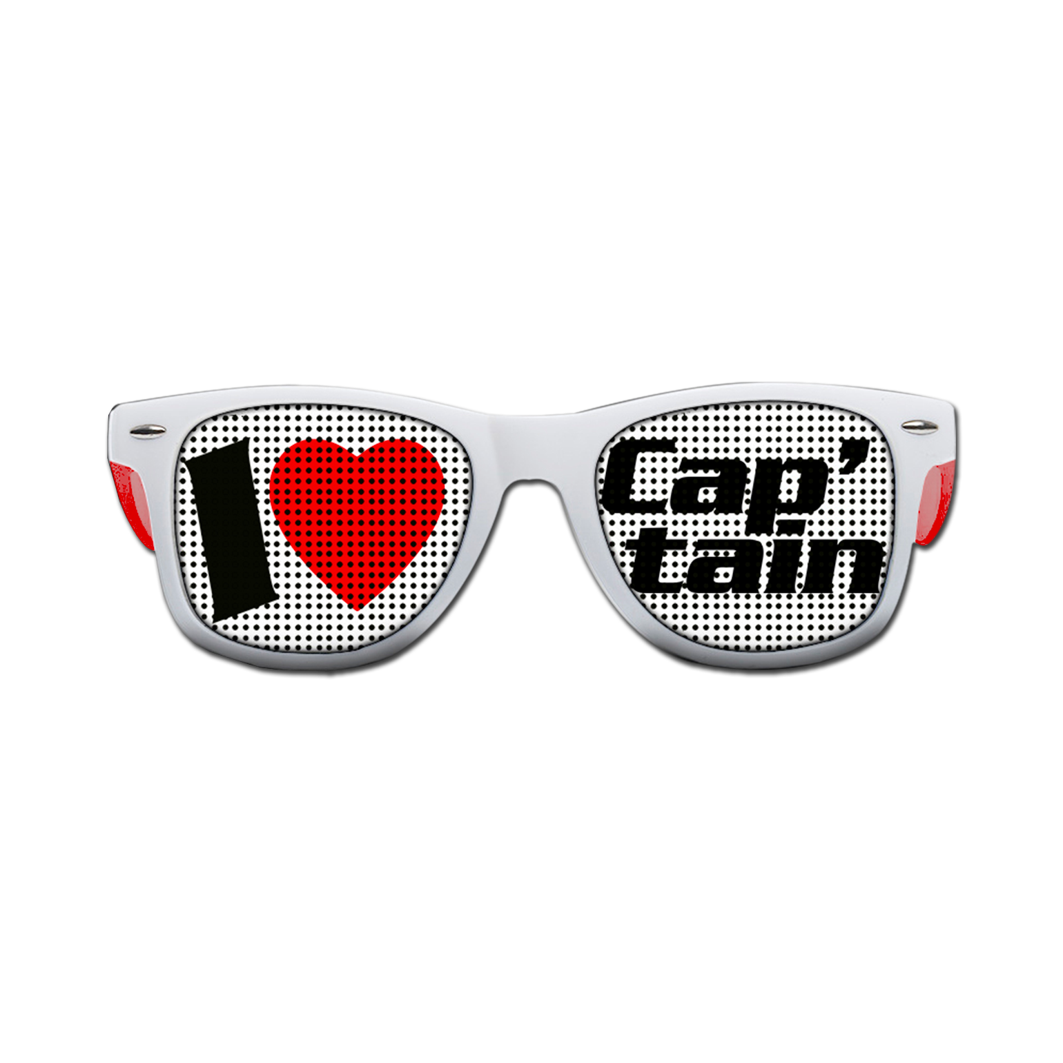 Monture blanche, branches rouges, verres blancs et inscriptions I LOVE CAP'TAIN